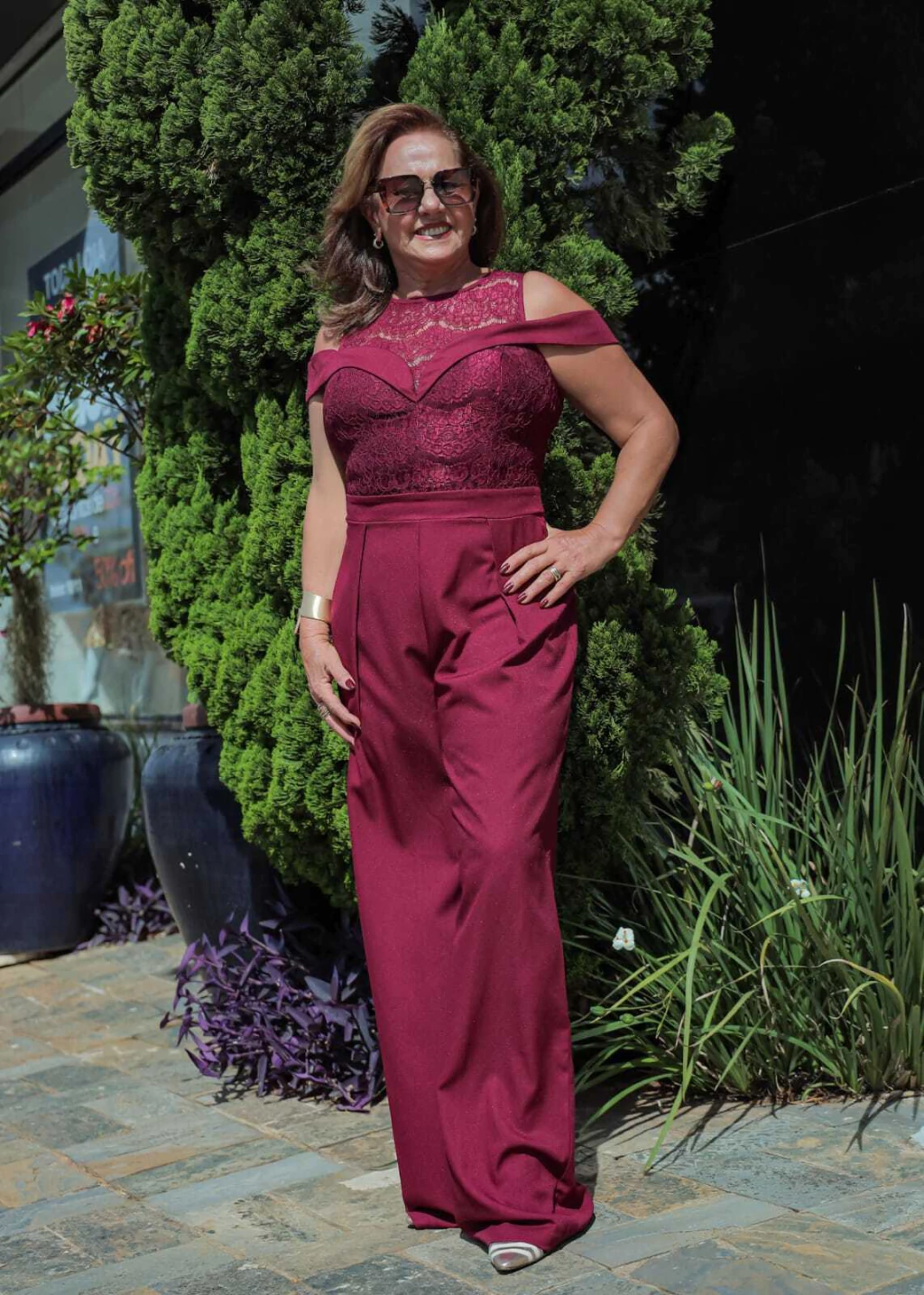 Macacão feminino elegante na cor vinho, confeccionado com corpo em renda delicada e recorte ombro a ombro que valoriza o colo. A peça possui cintura marcada e calça de caimento amplo, garantindo sofisticação e conforto. Ideal para eventos especiais e ocasiões que pedem um look moderno e refinado.